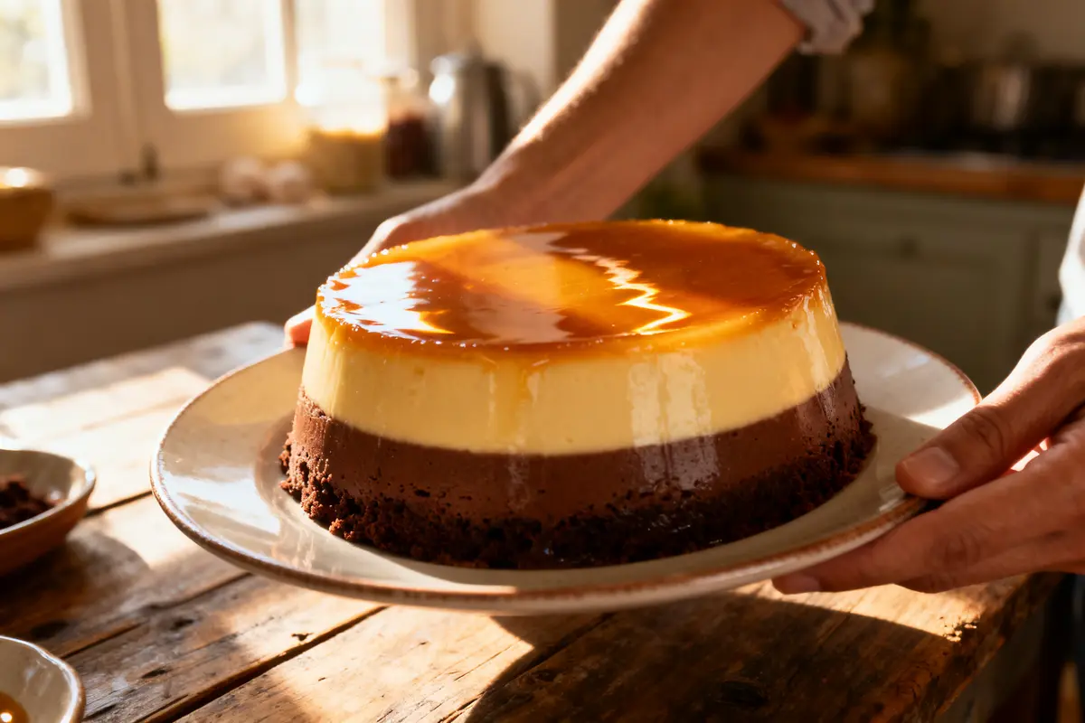 Le chocoflan porte parfois le nom de “gâteau impossible”. Pourtant, tout repose sur une cuisson douce et un mélange parfaitement équilibré. Vous découvrez au démoulage un flan lisse et crémeux, posé sur un gâteau au chocolat moelleux, le tout nappé d’un caramel doré. Le contraste est net et fonctionne à chaque tentative. C’est ce jeu de textures qui rend ce dessert si populaire.