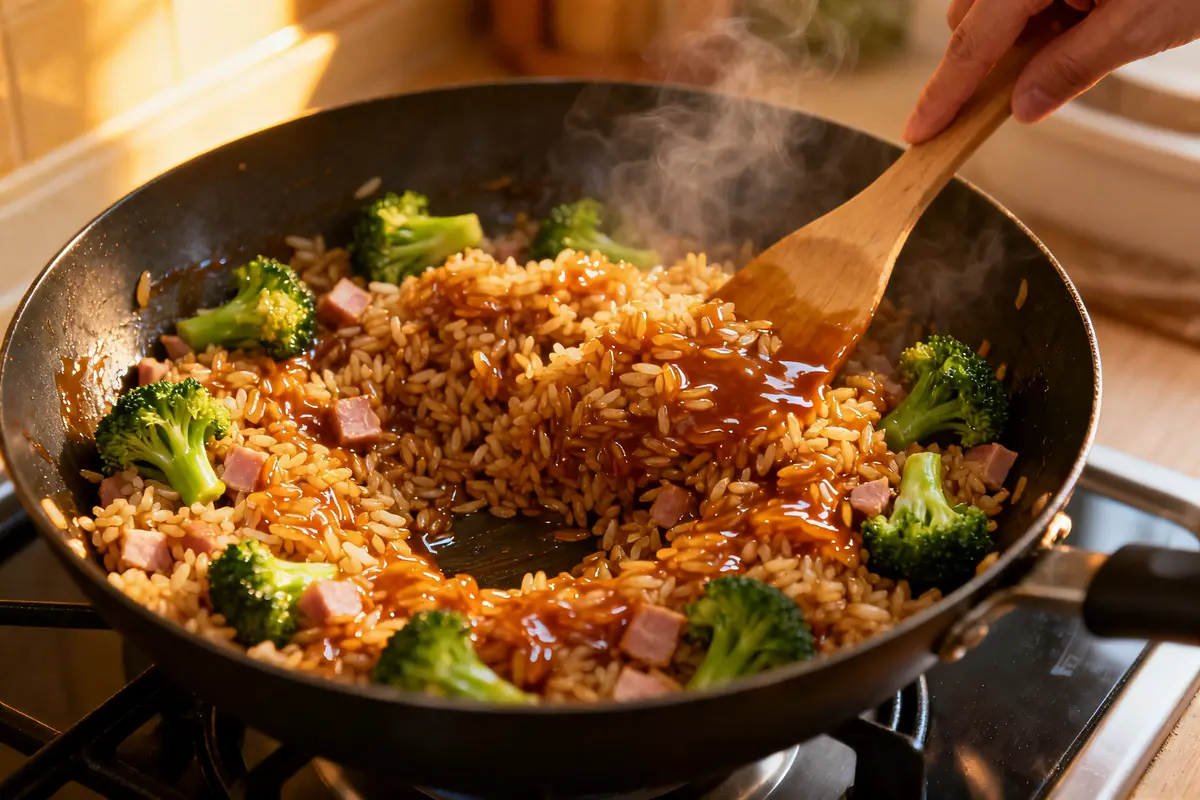 Le principe se mémorise en une phrase : pour 250 g de riz cuit, mélangez 2 càs de sauce soja, 1 càs de miel, 1 càs de vinaigre de riz et 1 càs d’eau. Brocoli : 3 minutes à l’eau puis 5 minutes à la poêle. Jambon, riz, et sauce 2 minutes pour caraméliser.